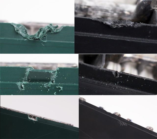 Vỏ ắc quy thông thường (màu xanh bên trái) - Vỏ ắc quy Graphene (màu đen xám bên phải) qua thử nghiệm đốt cháy và cắt xẻ.