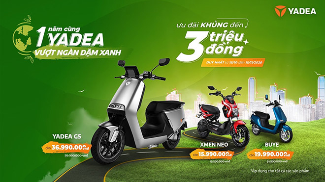 YADEA Việt Nam công bố chương trình “1 năm cùng YADEA vượt ngàn dặm xanh” có tổng ưu đãi lên đến 50 tỷ đồng hấp dẫn chưa từng có khi mua xe máy điện YADEA từ 15/10 đến 15/11/2020, với thông điệp đồng hành cùng hàng triệu người dùng Việt  lan tỏa lối sống xanh nhằm giảm thiểu ô nhiễm không khí.